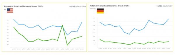 日本と同じく自動車生産台数が世界でも有数のアメリカとドイツで、自動車業界と電子機器業界のWebサイトへの流入量を調べました。