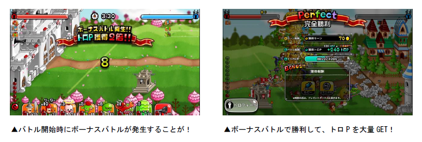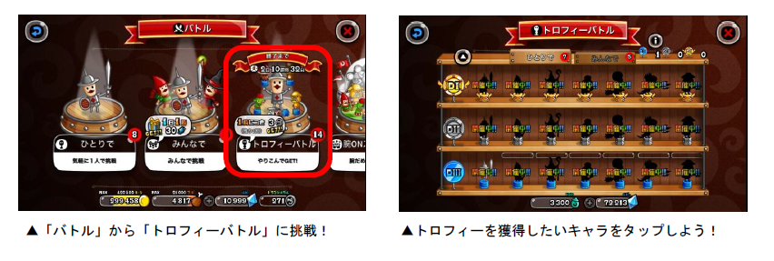 各キャラのトロフィーは、「トロP」を一定数貯めると獲得することができます。また、バトルを開始すると「ボーナスバトル」が発生することがあり、バトルの勝敗に関係なく、獲得トロPが2・3・5・10倍のうちいずれかの倍率で増加します。今回は「トロフィーでトロP争奪バトル」が同時開催され、バトルに勝利すると1000・200・150・100PのトロPが1日3回までランダムで手に入ります。獲得したトロPは未獲得トロフィーにチャージすることができます。