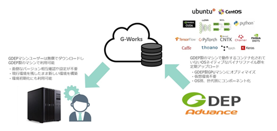 開発環境は、GDEP製ハードウェアで利用可能なGPUソフトウェアバイナリコレクション「GDEP G-Works(以下G-Works)」を搭載しており、Deep Learningに使用される主要なフレームワークを、各世代のNVIDIA GPUに最適化してビルドされています。