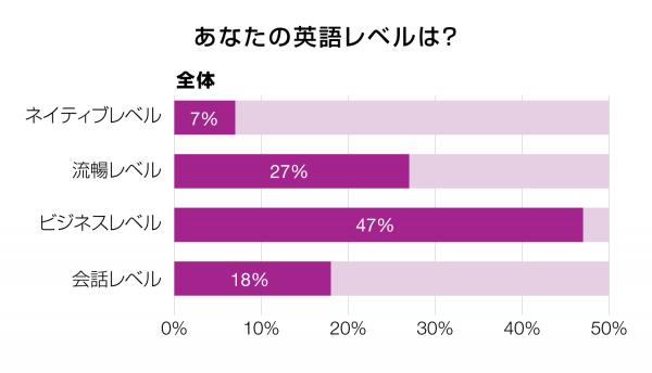このアンケート調査には、当社を通じて今年2月までの過去5年間に外資系の日本拠点またはグローバル展開の積極的な国内企業に転職した554人が回答を寄せました。英語力に対する自己評価を聞いたところ、ネイティブレベル(7%)、流暢レベル(27%)、ビジネスレベル(47%)、会話レベル(18%)、という結果になりました。ビジネスレベル・流暢レベルが多く、ネイティブレベルは7%に留まりました。ネイティブスピーカーのような調子で流暢に語彙に富んだ英語が話せなくとも、ビジネスシーンで論理的に意見を述べられ、熱意を伝えられる英語レベルが備わっていれば、ほとんどの仕事ではグローバル企業で活躍するのに充分であることを示唆します。
