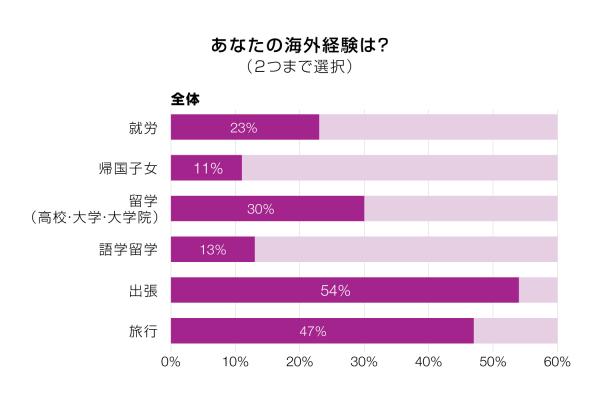 「あなたの海外経験は?」の質問では、1位「出張」(54%)、2位「旅行」(47%)、3位「高校・大学・大学院などへの正規留学」(30%)が就労(23%)、語学留学(13%)、親の駐在などによる帰国子女(11%)をしのいで上位を占めました。広い視野と多くの経験をもたらす点ではとても有益な海外での居住経験ですが、グローバルビジネスに携わる上では、英語を話し、国際感覚が身についてさえいれば必ずしも「必須」ではないと言えそうです。今回の調査でも、大学などへの正規留学、親の駐在などによる帰国子女、就労経験がある人はそれぞれ全体の1~3割程度で、旅行・出張のみの海外経験しかない人も31%いました。