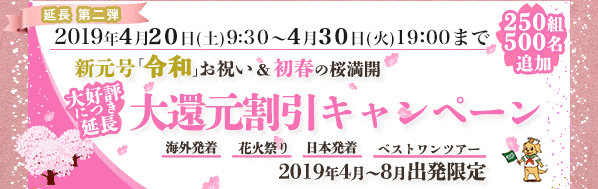 ◇キャンペーン内容:2019年4-8月出発の厳選コースを、最大5%オフの特別割引料金でご予約いただけます。※詳細はキャンペーン特設ページでご確認ください。