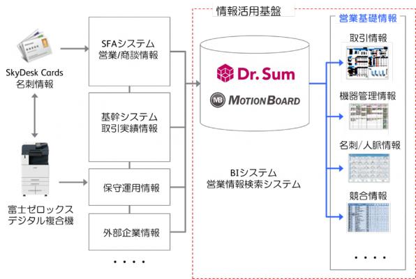 このソリューションは、デジタル複合機やスマートフォンで読み込んだ名刺情報を当社のクラウド名刺管理サービス「SkyDesk Cards R」に取り込み、SFA(Sales Force Automation)や基幹システムに蓄積、それら名刺情報やその他の顧客情報、商談情報、販売状況、契約内容、複合機やプリンターの利用・故障状況や仕入れ商品、調査会社による分析など社内外の情報を独自に構築した「情報活用基盤」に集約・統合DB化します。そして「Dr.Sum」(*2)、「Dr.Sum Connect 」(*3)、「MotionBoard」(*4)、AI、RPA(ロボティック・プロセス・オートメーション)を活用することで、データおよびレポート形式の標準化・共通化を加速します(図参照)。
