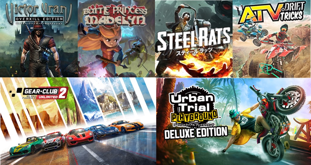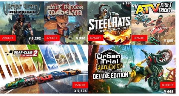 今年2月14日に発売されたハクスラアクション『ヴィクター・ヴラン オーバーキルエディション』や、春の大型アップデートによりニューアルを遂げた横スクロール2Dアクション『バトルプリンセス マデリーン』、『スティール ラッツ』、さらに、Nintendo Switchでは初となるオンラインマルチプレイに対応したリアルレースゲーム『ギア・クラブ アンリミテッド2』ほか、全7タイトルをお得プライスでご提供中です。