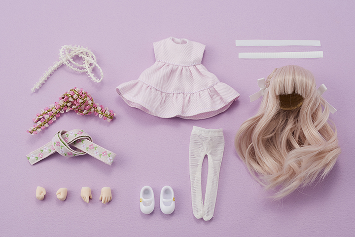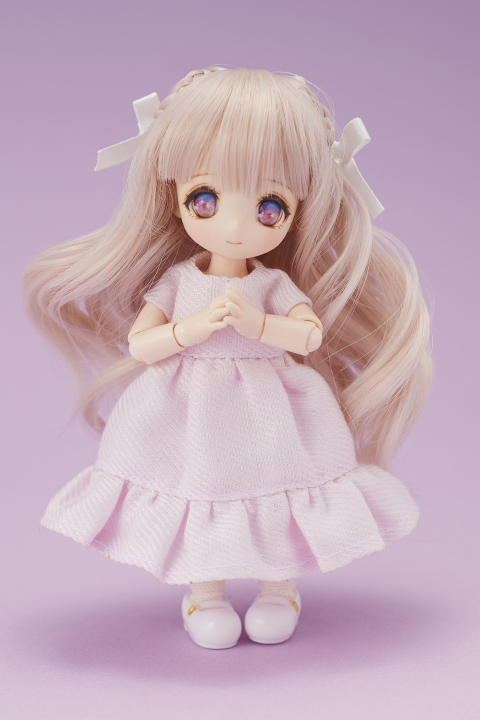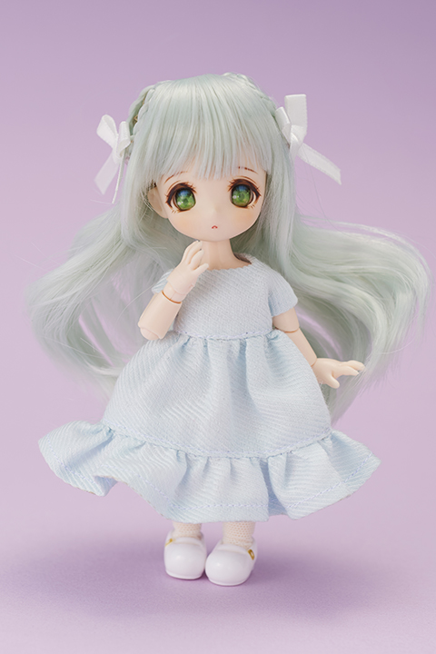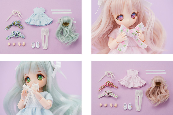 チロル&リボンは、11cm オビツボディのホワイティ仕様。アイはOut of Base さんデザインによる8mm オビツアイ。髪の毛はCalico wig 製「クレフウィッグ」が付属します。セットの衣装はそのままでも楽しめるシンプルなワンピース(縫製済み)。付属のリボンやチロリアンテープでお好きなデザインに飾り付けて、世界に一つだけのワンピースに仕上げてください。