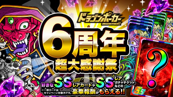 株式会社アソビズム(本社:東京都千代田区、代表取締役:大手智之)は、App Store・Google Playにて好評配信中のリアルタイム合体カードバトル『ドラゴンポーカー』で、2019年4月26日(金)より「6周年超大感謝祭」を開催いたします。好きなSSキャラが必ずもらえる「6周年記念SSプレゼントキャンペーン」や、竜石が毎日もらえる「6周年ログインキャンペーン」など様々なキャンペーンを開催いたしますので、どうぞご期待ください!