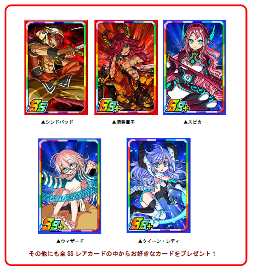 期間中に『ドラゴンポーカー』にログインした全てのユーザーの方を対象に、「コスト35のカード」「期間限定カード」「MAXガチャ限定カード」「GDRまで進化可能なカード」「DRAまで進化可能なカード」を除いたSS全種類の中から、お好きなものを1つプレゼントいたします。