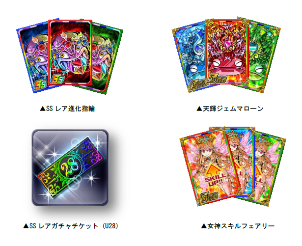 竜石 20個、SSレアガチャチケット 1枚、SSレアガチャチケット(U28) 1枚、SSレア進化指輪各属性 3枚ずつ、ドラゴンメダル 300枚