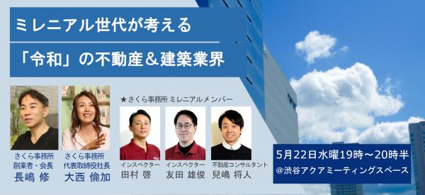 業界初の個人向け総合不動産コンサルティング・ホームインスペクション(住宅診断)を行う“不動産の達人 株式会社さくら事務所”(東京都渋谷区/代表:大西倫加)は、新たな元号「令和」を迎えたことを機に、不動産・建築業界に関わる25~35 歳の「ミレニアル世代」が中心となって、令和の同業界について考えるイベントを5 月22 日に開催します。