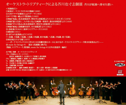 芥川也寸志が絃楽オーケストラとして作曲したオリジナル作品は、『絃楽のための三楽章(トリプティーク)』『間奏曲(オペラ『暗い鏡』より)』『絃楽のための音楽 第1番』『絃楽オーケストラのための陰画』の4作である。そのうち、『絃楽のための音楽 第1番』はオーケストラ・トリプティークの第2回演奏会で取り上げていることと、その楽想をより深め、編成を大きくしたのが『絃楽オーケストラのための陰画』であることから、今回は『絃楽のための音楽 第1番』を割愛した(ライヴCD化に際してボーナストラックとして過去の音源より収録した)。この3曲だけではトータルで30分ほどしかないこともあり「編曲」を含む個展となったが、これは吹奏楽の世界などで、同族楽器によるアレンジがより一層その分野の拡がり担っていること、そして優れた音楽は編成を変えて様々な楽器で親しまれ、人口に膾炙していくことを踏まえての選曲である。映画音楽は、芥川の様々な顔の一面であろうが、この側面も知ってほしい。編曲で特筆しておきたいのはまず『24の前奏曲』。芥川也寸志のエッセンスともいうべき小品の集まりであり、もしかしたら絃楽編曲もありえたかもしれない、という楽想が凝縮されている。初期の『譚詩曲』も芥川の徹底したオスティナートの美学が反映された逸品である。『アレグロ・オスティナート』や『オスティナータ・シンフォニカ』とも比肩できる堆積オスティナートの結実がある。私は、これらが新たなレパートリーになっていけばとも考えている。