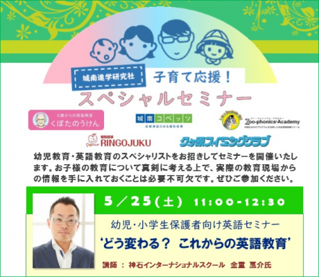 株式会社城南進学研究社(本社:神奈川県川崎市、代表取締役:下村勝己)は、「子育て応援!スペシャルセミナー」として、「幼児・小学生保護者向け英語セミナー “どう変わる? これからの英語教育”」を2019年5月25日(土)に開催。