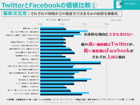 これらから見えてくることは、Twitterの方が、Facebookよりも各価値観項目への違いがハッキリ出ているということです。「これはそうだ」「これはそうでない」と価値観項目間でハッキリと違いをイメージしているということですね。