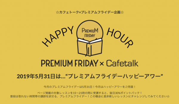 5月のプレミアムフライデーには、ハッピーアワーもご用意!ハッピーアワー(31日15~21時・日本時間)に特設ページ掲載の対象レッスンを受講すると後日30%分のポイントバック!