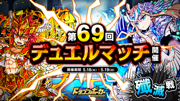 株式会社アソビズム(本社:東京都千代田区、代表取締役:大手智之)は、App Store・Google Playにて好評配信中のリアルタイム合体カードバトル『ドラゴンポーカー』で、2019年5月16日(木)より 「第69回デュエルマッチ本戦」を開催いたします。今回のルールは「殲滅戦」です。デュエルマッチでは、バトルで獲得できる「デュエルP」に応じてランキングが決まり、リーグ終了時に報酬が獲得できます。また、累計勝利数に応じて、限定カードも手に入ります。相手の心理を読み、1vs1の真剣勝負に挑みましょう!