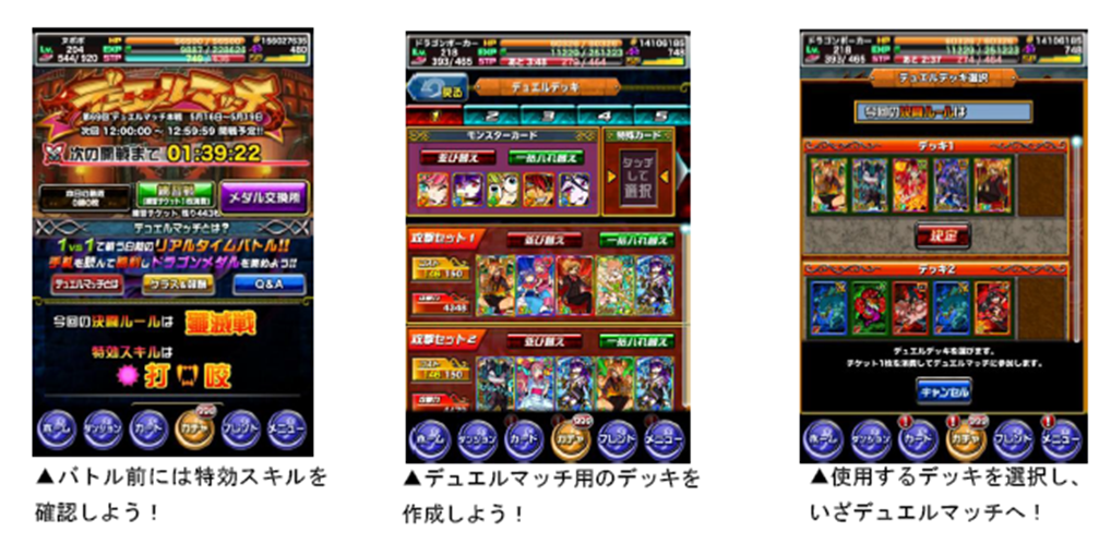 デュエルマッチでは、通常よりも高い効果を発揮する「特効スキル」が設定されています。今回の「デュエルマッチ」の特効スキルは、打・咬です。特効スキルのカードをデッキに入れて、有利にバトルを勝ち進めましょう。