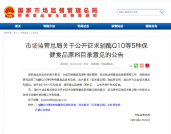中国市場監督管理総局は、本年4月1 日より、(1)コエンザイムQ10、(2)メラトニン、(3)魚油、(4)破壁霊芝胞子粉、(5)スピルリナの5種の健康食品の原料について、技術的要件及び起案主旨の説明を公開し意見・提案を募っていたが、4月30日を以て意見聴取を終え、今後、健康食品原材料リストに追加するかの検討に入った。同時に健康食品のもつ健康効能に対しても調整をおこない、併せて意見聴取をおこなうこととした。