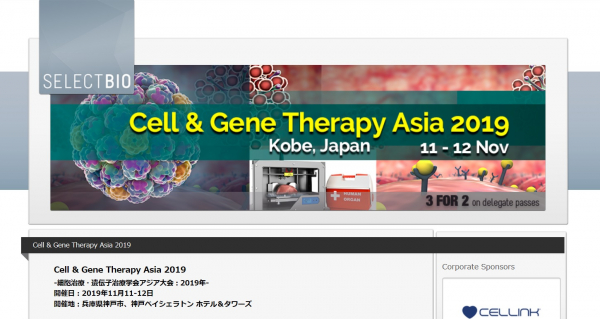 先端分野の市場情報を提供する株式会社グローバル インフォメーション(神奈川県川崎市、代表取締役社長:小野 悟)は、2019年11月11-12日 兵庫県神戸市、神戸ベイシェラトン ホテル&タワーズにて開催されますSelect Biosciences, Ltd.主催 国際学会 「Cell & Gene Therapy Asia 2019-細胞治療・遺伝子治療学会アジア大会 2019年」の代理店として参加のお申込み受付を5月17日より開始致しました。
