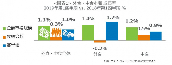 外食・中食市場全体の2019年第1四半期の成長率(図表1)をみると、客単価の1.0%増が寄与して、売上(市場規模)は、5兆2536億円で対前年同期比1.3%増となりました。客数(食機会数)は、前期まで2期連続プラス成長で、今期は+0.3%の微増となりました。中食の客数は0.5%増加したものの、外食で0.2%減となりました。客単価は、外食でも中食でも上昇しました。