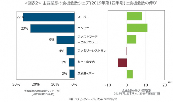 2017年から2018年の前半までは、客単価の成長率が高く、客数(食機会数)は伸び悩み、客単価の成長によって市場を成長させていましたが、2018年第3四半期から客単価の成長率が低下し、客数(食機会数)が成長し始めました。ところが、今期はまた以前の傾向に戻ったような数値になっています。これは、また値上げが増えてきたことで、節約志向が強まってきたことが原因と考えられます。価格が上がったから、購入点数を減らす動きも出ており、不要不急の外食・中食機会が今後消費増税にむけて減少していくことも推測されるでしょう。