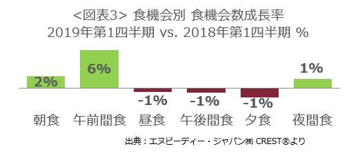 食機会別の食機会数成長率(図表3)をみると、朝食が2%増加、午前間食が6%と大幅増となりました。サッカー観戦の好影響もあり、夜の間食も1%増加しました。