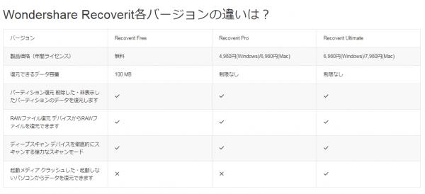 Wondershare Recoverit各製品の違いについては、以下画像をご参照ください。