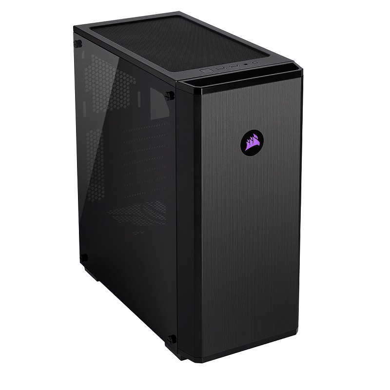 ケースフロントには、120mmサイズのRGBファンを1基標準搭載しています。ASUS,Gigabyte,MSI製マザーボードによるRGB制御に対応したファンは、ケース前面のCorsairロゴをライトアップします。