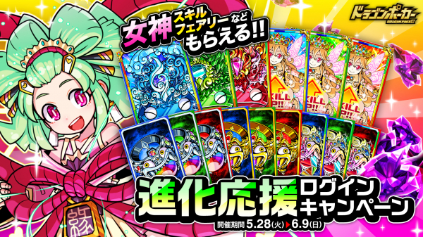 株式会社アソビズム(本社:東京都千代田区、代表取締役:大手智之)は、App Store・Google Playにて好評配信中のリアルタイム合体カードバトル『ドラゴンポーカー』で、2019年5月28日(火)より「進化応援ログインキャンペーン」を開催いたします。2日ログインごとに「天輝ジェムマローン」や「SSレア進化指輪」など豪華アイテムをプレゼント!ログイン10日目には「女神スキルフェアリー」が必ずもらえます。『ドラゴンポーカー』に毎日ログインして、豪華報酬を受け取りましょう!
