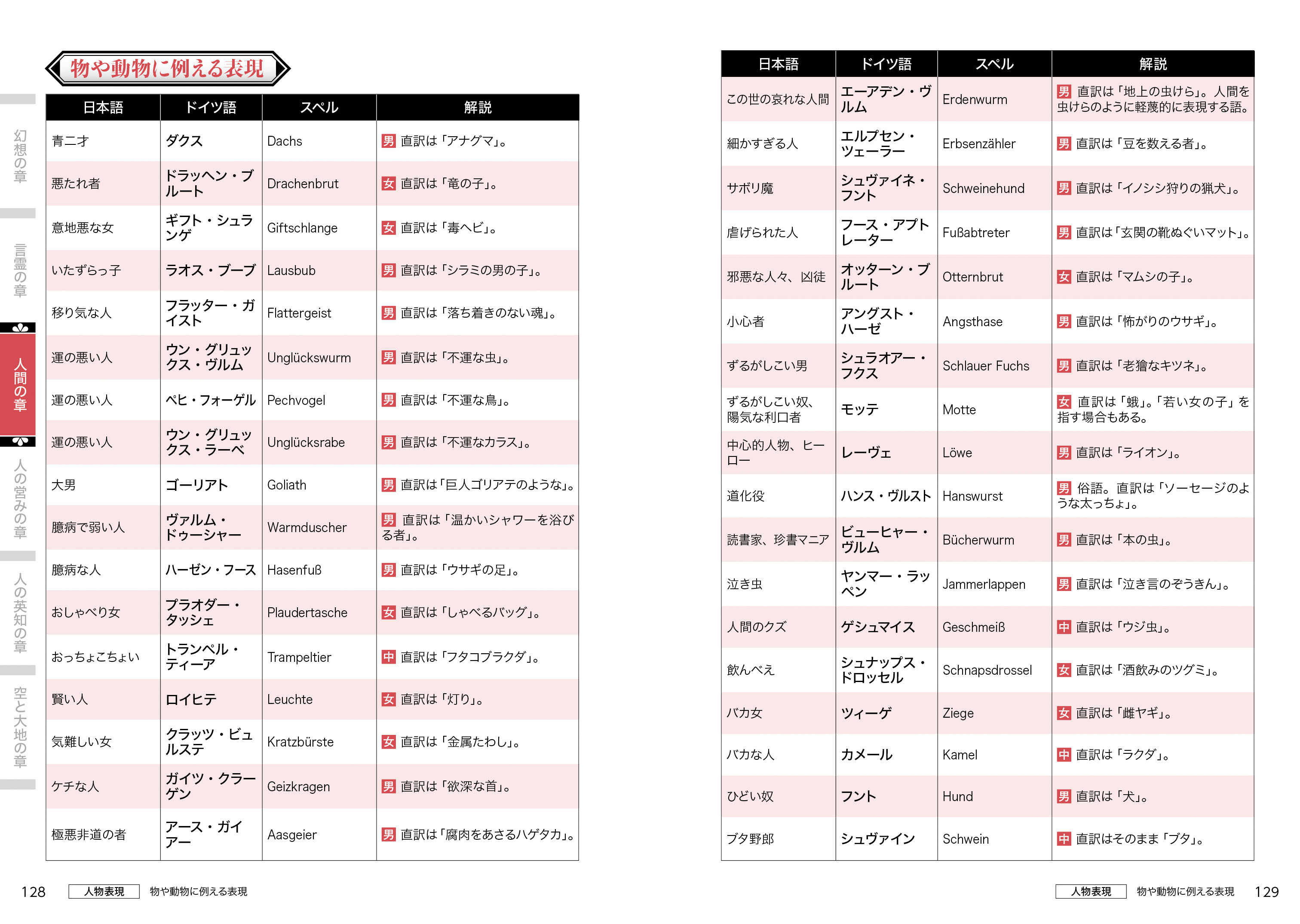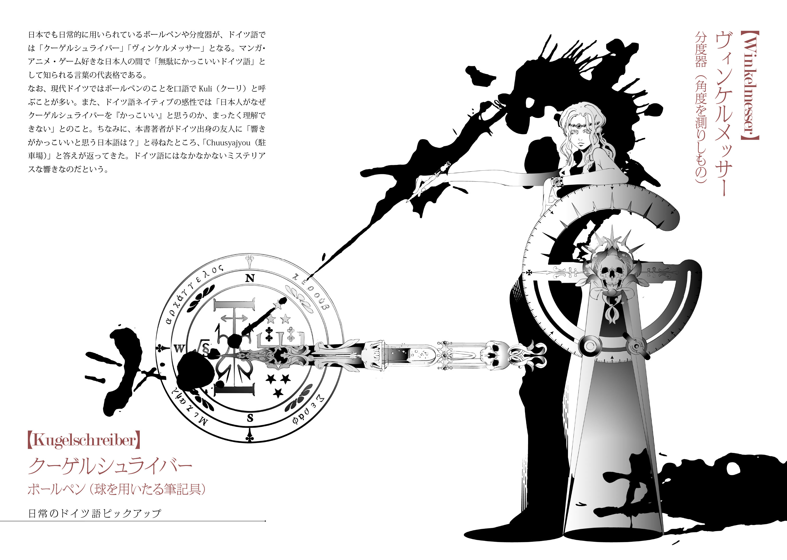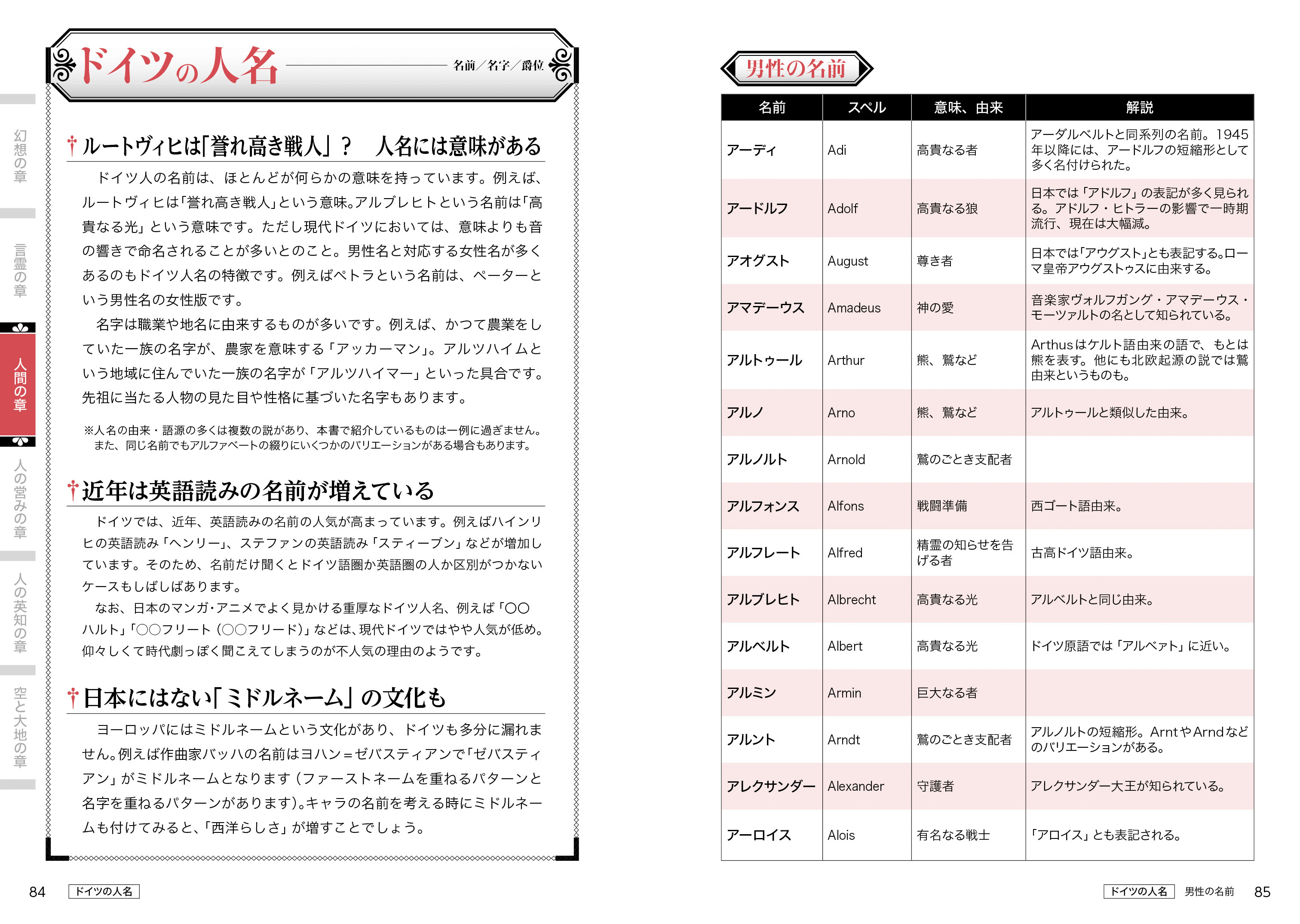 ドイツ語で闇は「ドゥンケルハイト」、地獄の苦しみは「ヘレンクヴァール」、真実は「ヴァールハイト」、気高き心は「エーデルムート」……などなど、マンガやアニメ、ゲームの名付けに活かせる言葉を紹介。