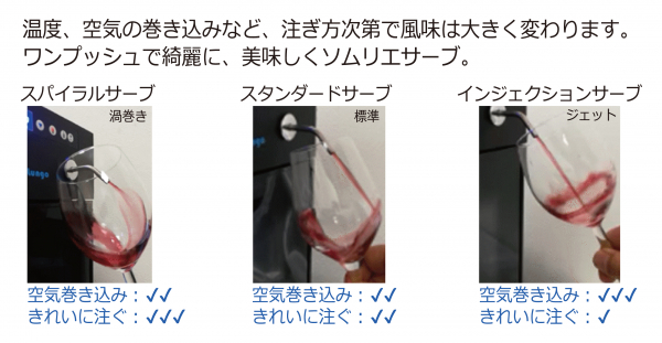それにより開栓したワインやお酒を酸化や変質から守り、オリジナルの風味を長期間(最大約4週間)保ち、いつでもワンプッシュで美味しさを引き出し注ぎます。