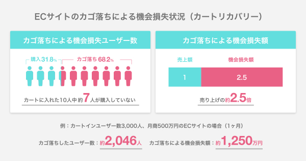 上記内容から計算すると、例えば、「カートインユーザー数が3,000人、月商が500万円のECサイト」の場合、カゴ落ちしたユーザー数は約2,046人、カゴ落ちによる機会損失額は約1,250万円発生している可能性があります。