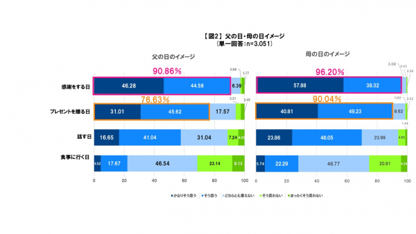 「あなたが父の日にイメージするもの・コトの程度を教えてください」と質問したところ、「父親に感謝をする日」が「かなりそう思う」と「そう思う」を合わせて90.86%となりました。母の日のイメージについても、同様の質問をしたところ、「母親に感謝をする日」は「かなりそう思う」と「そう思う」を合わせて96.20%となり、父の日と似た結果となりました(図2参照)。