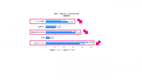 また、「旦那(夫)」にする予定について注目し、「妊娠期」のママと「0歳以上」の子どもがいるママの回答を比較した結果、「妊娠期」のママは「何もしない」と46.92%が回答したのに対し、「0歳以上」の子どもがいるママは37.60%という結果になりました(図4参照)。また、「プレゼントを贈る」と回答した人は「妊娠期」では17.31%なのに対し、「0歳以上」では24.86%と増加し、「感謝の気持ちのみ伝える」に関しても同様に「妊娠期」のママに比べ、「0歳以上」の子どものいるママが多い結果となりました。この結果から、妊娠期ではまだ早く、子どもが生まれてから「旦那(夫)」に対して父の日を祝うようになる傾向があるようです。