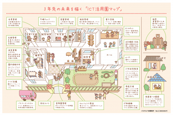 サンロフトは、保育者向けIT専門紙「パステルIT新聞(https://passtell.jp/)」として同イベントのメディアパートナーになり、ブースを出展します。テーマは、保育者の働き方改革や新しい時代に求められる教育・保育活動を推進するためのICT活用です。ICT化といっても幅広く、何をすべきかわからないという園関係者が多いことから、弊社が独自に作成した、ICT活用の具体例が一目でわかる「ICT活用園マップ」を展示しています。これに、来場者の「やってみたい」「気になる」と感じる項目をシールで投票してもらいながら、園経営者や保育者の課題とその解決につながるICT活用の情報を提供します。