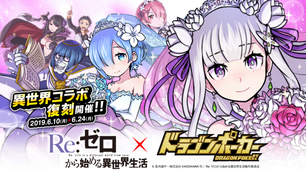 株式会社アソビズム(本社:東京都千代田区、代表取締役:大手智之)は、App Store・Google Playにて好評配信中のリアルタイム合体カードバトル『ドラゴンポーカー』で、2019年6月10日(月)よりTVアニメ『Re:ゼロから始める異世界生活』との復刻コラボイベントを開催いたします。イベント期間中、「エミリア(花嫁Ver.)」や「レム(花嫁Ver.)」など『リゼロ』のキャラクターたちが限定で登場!期間限定で開催される夢のイベントをどうぞお楽しみください。