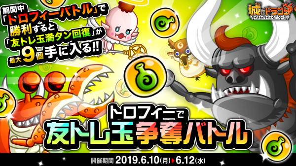 株式会社アソビズム(本社:東京都千代田区、代表取締役:大手智之)は、App Store・Google Playにて好評配信中の『城とドラゴン』で、6月10日(月)より、各キャラのトロフィー獲得を目指す「トロフィーバトル」と、トロフィーバトルに勝利すると友トレ玉満タン回復が1個もらえる「トロフィーで友トレ玉争奪バトル」を開催いたします。また、「シルバークラス以下限定リーグ」も同時開催いたします。