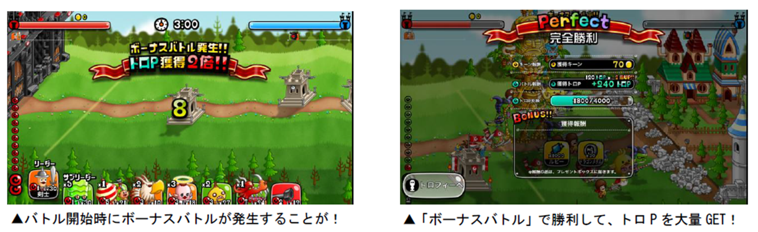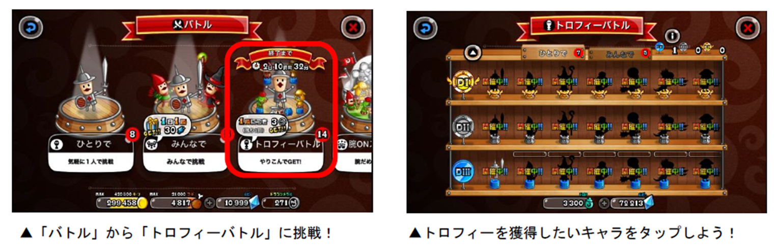 各キャラのトロフィーは、「トロP」を一定数貯めると獲得することができます。トロPは「キャラのLvが20以上」「うまP200以上」など、各キャラによって異なる条件を満たした状態でバトルを行なうと獲得できます。また、バトルを開始すると「ボーナスバトル」が発生することがあり、バトルの勝敗に関係なく、獲得トロPが2・3・5・10倍のうちいずれかの倍率で増加します。ボーナスバトルが発生したら、勝利してトロPの大量獲得を目指しましょう!