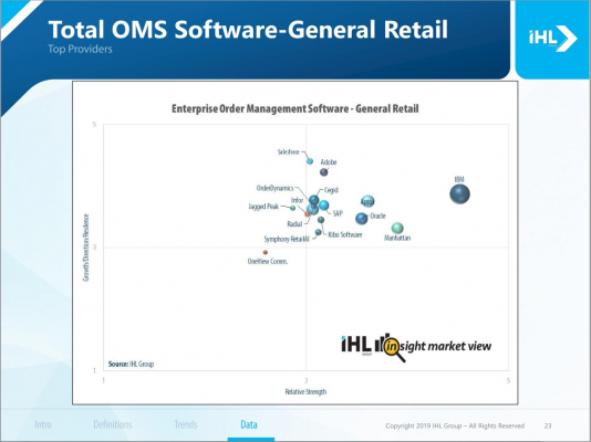 米国調査会社IHLグループ (IHL Group) の調査レポート「企業の受注管理:ユニファイドコマースの基盤」は、単一受注管理システム導入の動向と阻害要因を概観し、障害を取り除くための痛みや、競争力のある店舗やロケーションの活用についても記載している。この市場の主要ベンダに注目し、市場規模とベンダのポジショニングについても記載している。中央集権的な発注管理処理への移行についても述べている。