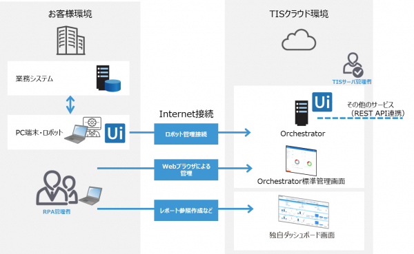 2019年6月6日に、TISインテックグループのTIS株式会社(本社:東京都新宿区、代表取締役会長兼社長:桑野 徹、以下 TIS)は、RPA (Robotic Process Automation) 製品「UiPath」※1 で作成したロボット(端末)を一元的に管理・統制する管理サーバ「UiPath Orchestrator」に、独自ダッシュボードを加えてクラウド提供する「RPA管理統制基盤サービス」を開始することを発表しました。