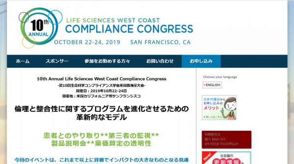 学会:「10th Annual Life Sciences West Coast Compliance Congress-第10回生命科学コンプライアンス学会米国西海岸大会」