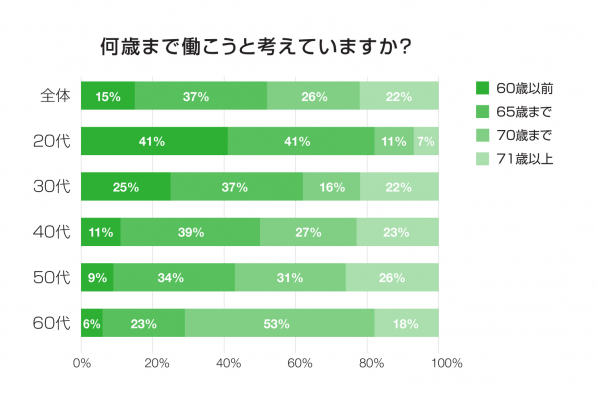 さらに回答者の年齢別に結果を見ると、20代の回答者のうち4割が「60歳以前」と回答。「70歳まで」または「71歳以降」も働くとの考えを示したのは20代全体の2割に満たないことも分かりました。30代、40代、50代の中核世代では年齢層が上がるごとに「60歳以前」を選んだ回答者の割合が減り、同時に「71歳以上」を挙げた回答者が増えました。一方、既に自らが現役シニア社員である60代の年齢グループの回答は、「70歳まで」(53%)が過半数を占め、「71歳以上」を挙げた人は同年齢グループ全体の18%と意外に少ないことが分かりました。70歳継続雇用が議論される中、過半数が70歳またはそれ以上まで働く考えを示したのは50代と60代のみでした。この割合はビジネスの中核を担う40代では50%、38代では38%に留まりました。