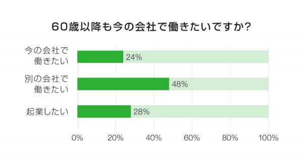 60歳以降の職業生活について、何歳まで働くつもりかを聞いた質問では「65歳まで」を挙げた回答者が全体の37%と最も多く、次いで「70歳まで」(25%)という結果でした。「71歳以上」(22%)と合わせると、85%が少なくとも65歳までは働くという意向を示したことが分かります。また最も多くの企業が定年退職の対象年齢に定めている60歳まであるいはそれ以前と答えた回答者は、全体のわずか15%に留まりました。定年延長、シニア再雇用が議論される中、働き手にもその意識がかなり浸透していることがうかがええる結果となりました。また、「60歳以降も今の会社で働きたいか?」の問いでは「今の会社で働きたい」(24%)、「別の会社で働きたい」(48%)、「起業したい」(28%)という結果になりました。