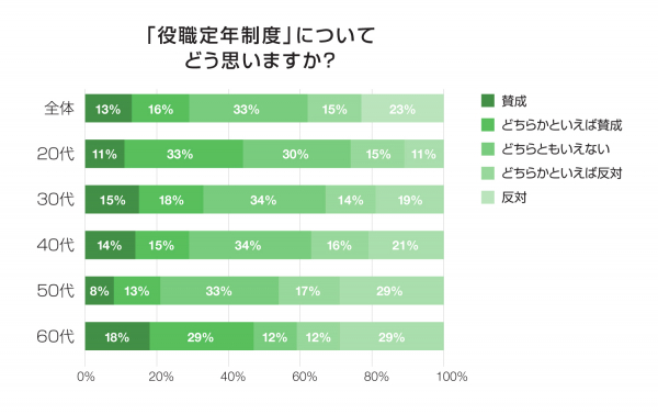 55歳前後に達したら管理職を降りる「役職定年制度」については、回答者全体の38%が「反対」または「どちらかといえば反対」と答えました。50代の回答者に絞るとこの割合が46%に上ったのに対し、20代に絞ると「賛成」または「どちらかといえば賛成」が41%となり、年齢層によって賛否が分かれる結果となりました。また、ここでもすでに当事者を経験済みの60歳以上の年齢グループの回答は、賛成派(47%)が、反対派(41%)を上回り、間もなく直面することが見込まれる50代との価値観の隔たりを示唆する結果となりました。