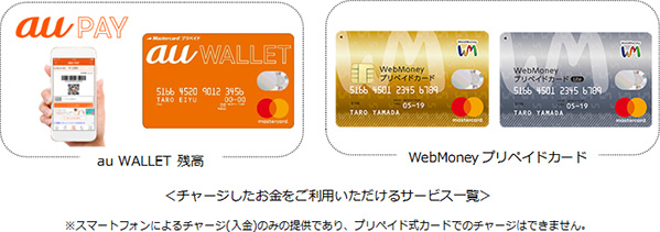 なお、チャージされた「au WALLET 残高」は、「au PAY」や「au WALLET プリペイドカード」としてお店でのお買い物やお支払いにご利用いただけます。