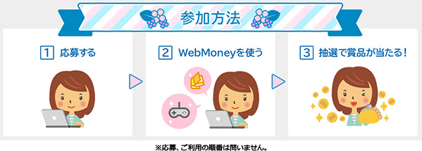 期間中、WebMoneyをWebMoney加盟店で合計2,000POINT以上ご利用のうえ、ご応募いただいた方の中から抽選でWebMoneyをプレゼントします。