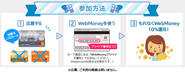 期間中、「WebMoneyプリペイドカードLite」を使ってWebMoneyをWebMoney加盟店で合計2,000POINT以上ご利用のうえ、ご応募いただいた方を対象に、ご利用金額の10%分のWebMoneyをもれなく還元します。