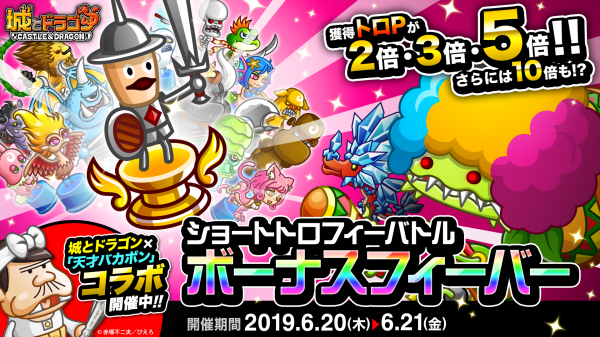 株式会社アソビズム(本社:東京都千代田区、代表取締役:大手智之)は、App Store・Google Playにて好評配信中の『城とドラゴン』で、「ショートトロフィーバトル」および「ボーナスフィーバー」を2019年6月20日(木)より開催いたします。また、フリー対戦に勝利すると、「Sドリンク」や「無料ご飯大盛り券」などのレアアイテムが報酬としてもらえる「フリー対戦グルメ争奪バトル」も同時開催いたします。
