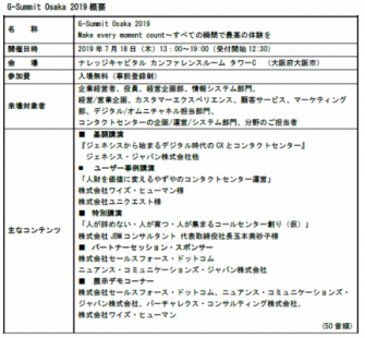 東京 - 2019年6月20日 -ジェネシス・ジャパン株式会社(東京都新宿区、代表取締役社長:細井洋一、以下ジェネシス)は、カスタマーエクスペリエンス(以下CX)、コンタクトセンターに関する最新の情報や業界トレンド、テクノロジーならびにジェネシス・ソリューションを紹介するユーザー・カンファレンス『G-Summit 2019 』(https://www.genesys.com/events/xperience19)を東京、大阪の2会場において開催します。東京は7月11日、虎ノ門ヒルズフォーラム(東京都港区)、大阪は7月18日、ナレッジキャピタル カンファレンスルーム タワーC(大阪府大阪市北区)にて開催いたします。今年は「Make every moment count~すべての瞬間で最高の体験を」をテーマに、コンタクトセンターのクラウド化、AIの活用、セールス&マーケティングとの連携など、コンタクトセンターからデジタル・チャネルを含む顧客接点におけるカスタマージャーニー全体をマネジメントするジェネシスのCXソリューションを披露します。