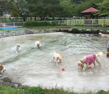 ■施設 関東最大級のドッグラン施設。広々とした芝生のドッグランに大きなドッグプールで愛犬と思い切り走り回ることができます。丹沢の山々に囲まれ近くを流れる中津川沿いには桜並木も。清流のせせらぎも心地よく、人も動物ものびのびすごせる静かな環境です。