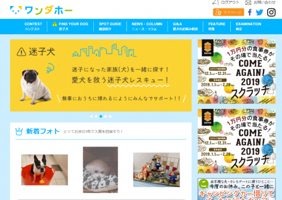 「ワンダホー」は、災害時や緊急時に役立つ大切な愛犬を探せる「迷子犬掲示板機能」や愛犬をみんなに自慢できるリアルタイムの「フォトコンテスト機能」、愛犬と行ける「宿泊施設紹介」など、様々なコンテンツを展開している、愛犬と飼い主のためのポータルサイトです。