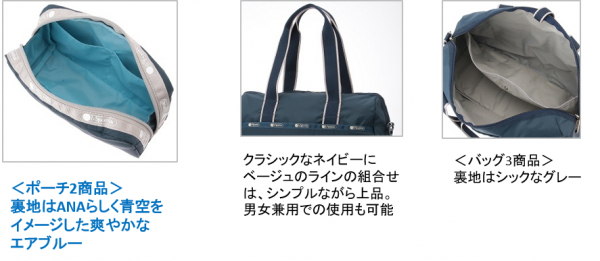 『LeSportsac for ANA』は、軽量と優れた耐久性により幅広い世代から支持され続けているブランド「LeSportsac」とANAが大人のトラベルシーンで活躍する商品を共同開発したコラボレーションラインです。LeSportsacの豊富なラインナップの中から人気の高いポーチ2点、バッグ3点、全5商品をANAオリジナル配色で別注しました。表地は落ち着いた雰囲気のネイビーを基調に、ベージュのラインを効かせた上品な配色で、旅行や出張から日常使いまで、季節や洋服を選ばずに使いやすい商品です。